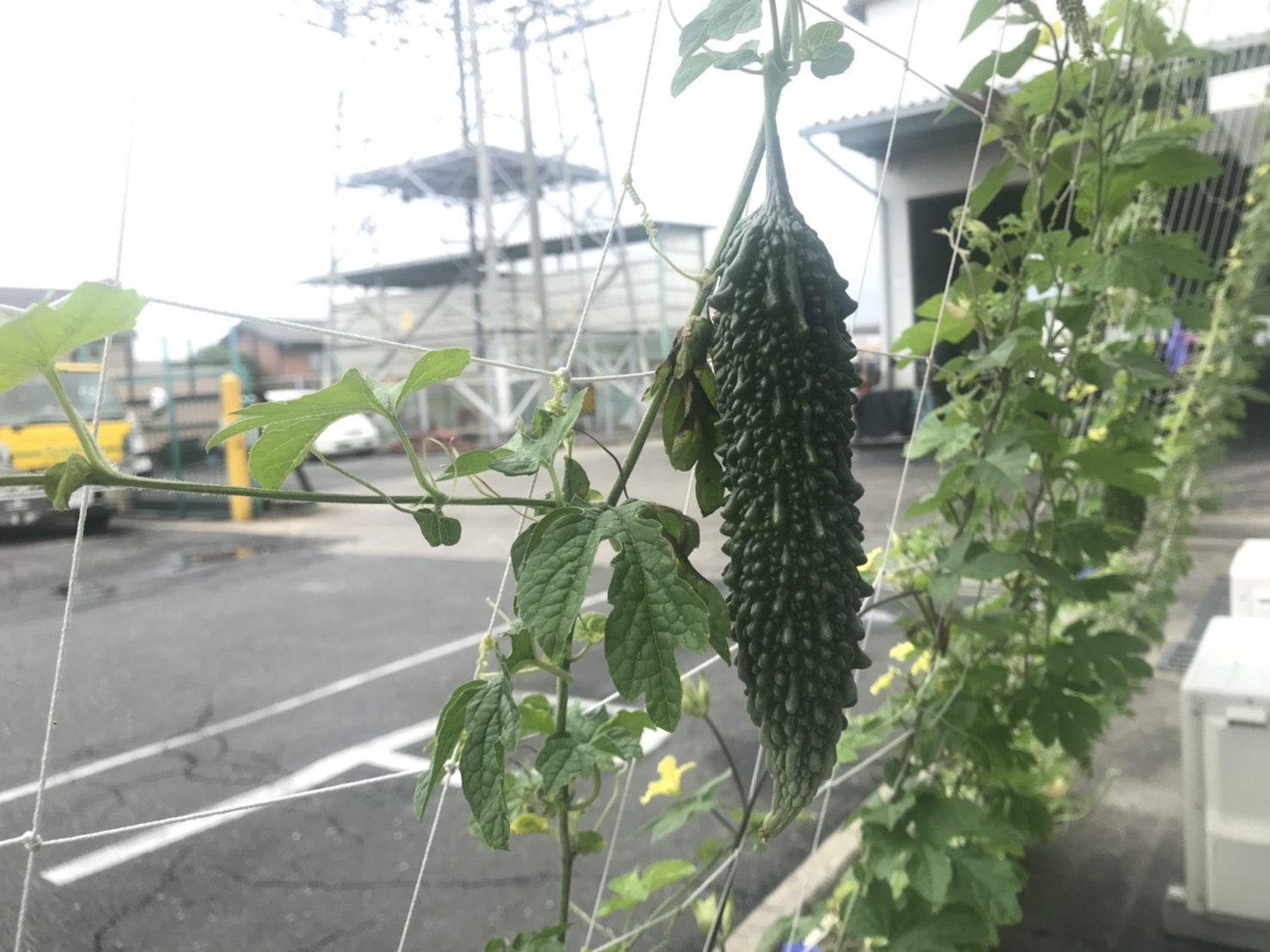 今年の5月中旬に始めたグリーンカーテンのガーヤが収穫時期になりました。